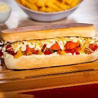 pão, carne, queijo, presunto, ovo, bacon, calabresa, alface americano, cebola roxa, picles, milho, ervilha, passas, alho torrado, azeitona, ovo de codorna, ketchup, maionese (helmans), mostarda, queijo parmesão fresco ralado, batata palha + creme a sua escolha, catupiry ou cheddar