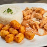 Acompanha arroz branco, purê de batatas e mix de legumes.