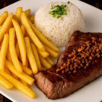 Contra-filé grelhado, acompanhado de alho torrado, arroz branco, farofa e batata frita