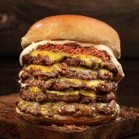 Pão Brioche, 5x Blend 80g do Chef, 5x Queijo Cheddar, Queijo empanado e Molho Especial do Chef