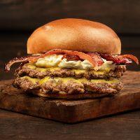 Pão Brioche, 2x Blend de 150g do Chef, 2x Queijo Cheddar, Bacon, Cebola Caramelizada e Alface.